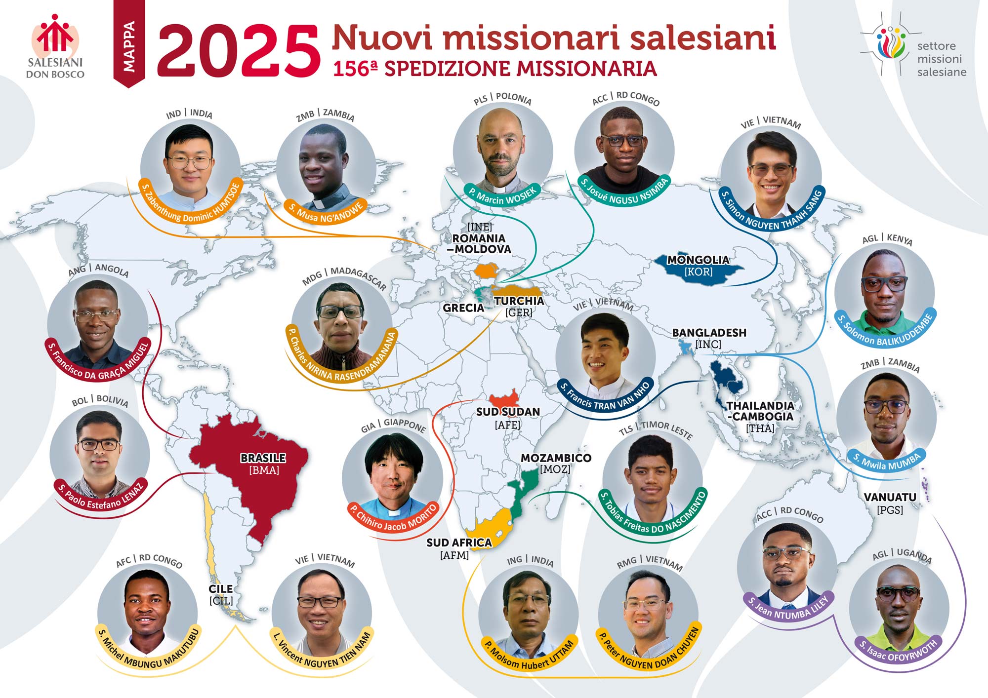 Durante la celebrazione della nuova spedizione missionaria (in diretta su YouTube), diciannove missionari riceveranno la croce di cuoio, segno del loro mandato e simbolo della consegna che Don Bosco fece ai suoi primi partenti. Le loro destinazioni — Mongolia, Thailandia, Cambogia, Mozambico, Sud Sudan, Brasile e Cile — raccontano la vitalità e l’attualità del carisma salesiano, che continua a spingersi là dove ci sono giovani da amare, da educare, da far crescere nella fede. Ogni Paese rappresenta una sfida e una promessa: nuove terre di missione dove la presenza salesiana semina fraternità, educazione e speranza, costruendo ponti di pace e comunità vive.