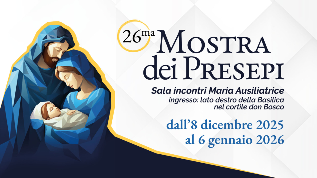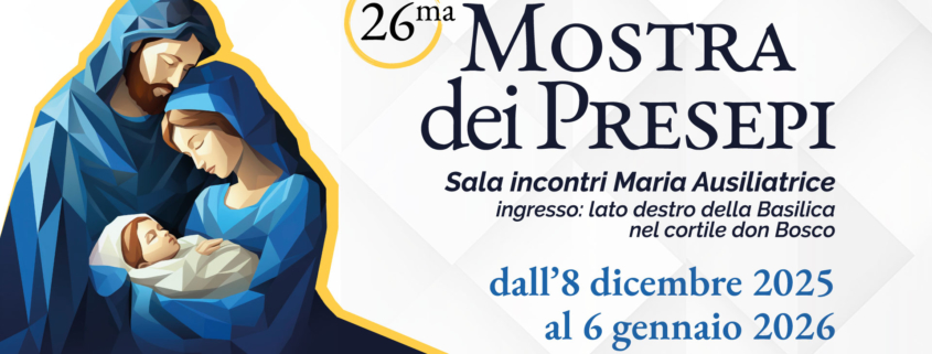 Per prepararci al meglio al Santo Natale torna, dall8 dicembre 2025 al 6 gennaio 2026, la tradizionale mostra dei presepi, che per la 26ma edizione sarà apprezzabile presso la Sala incontri Maria Ausiliatrice (ingresso dal lato destro della Basilica, nel cortile don Bosco).