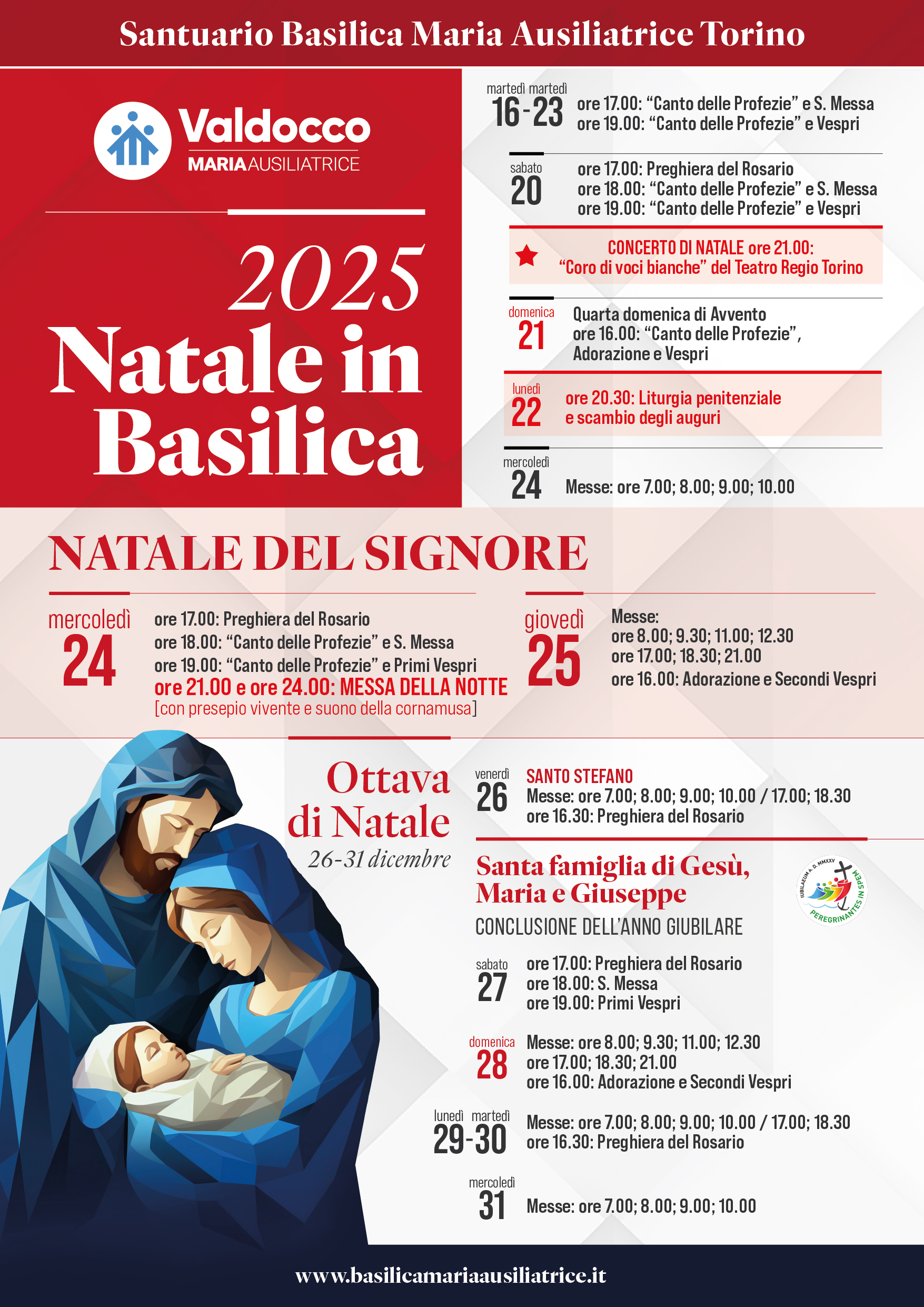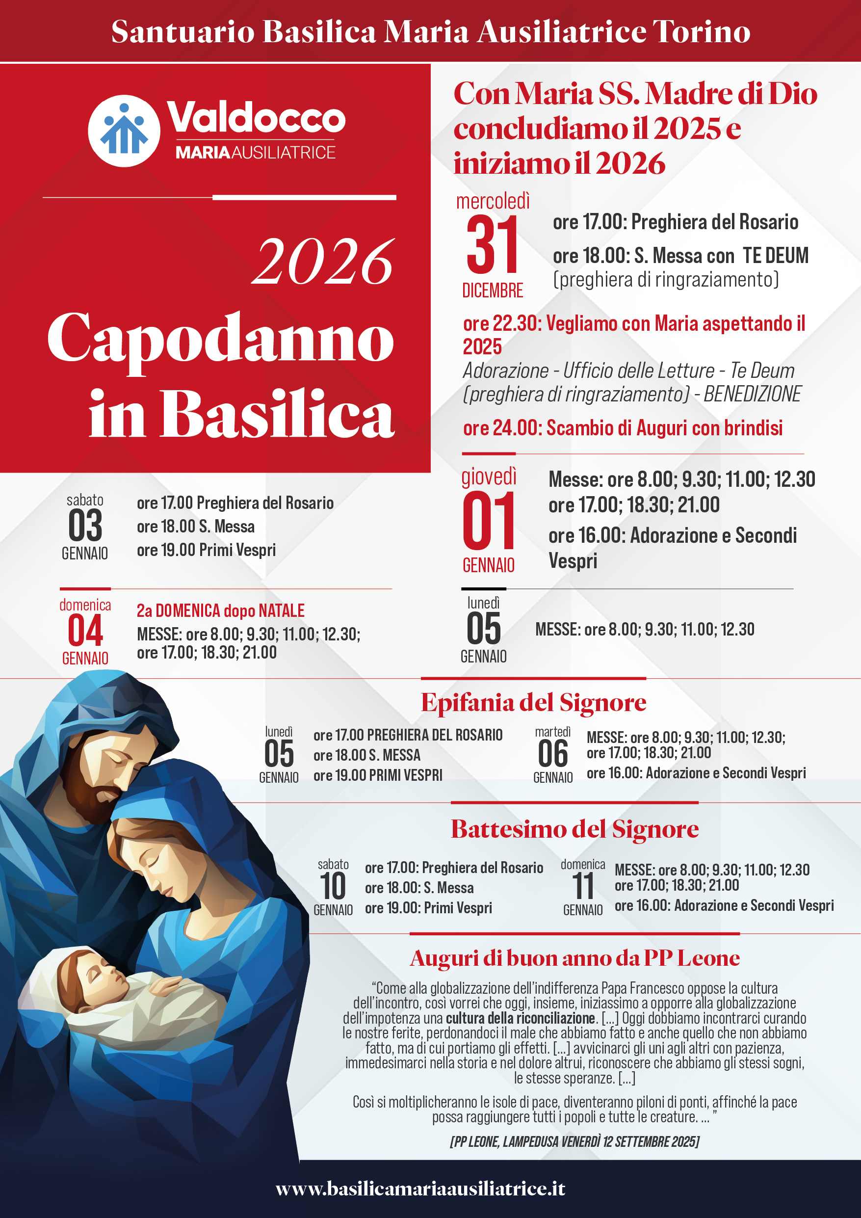 Si rende nota la programmazione della Basilica Maria Ausiliatrice di Valdocco in merito alle celebrazioni per il Natale e per l’inizio del nuovo anno 2026.