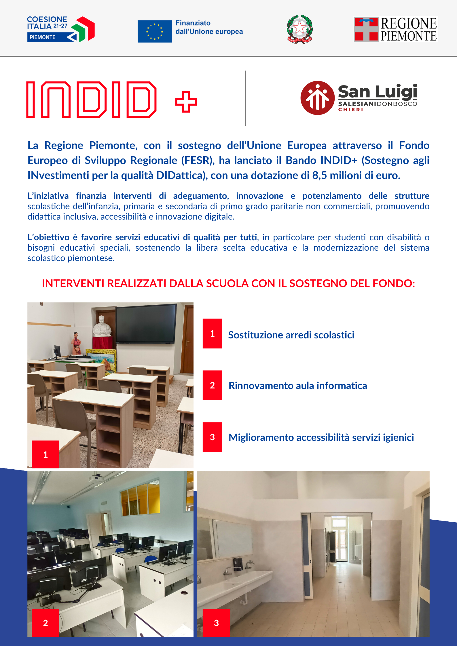 La Regione Piemonte, con il sostegno dell’Unione Europea attraverso il Fondo Europeo di Sviluppo Regionale (FESR), ha attivato il Bando INDID+ (Sostegno agli INvestimenti per la qualità DIDattica), destinato alle scuole paritarie dell’infanzia, primaria e secondaria di primo grado non commerciali. L’obiettivo è favorire ambienti educativi più moderni, inclusivi e accessibili, sostenendo interventi di innovazione e potenziamento delle strutture scolastiche.