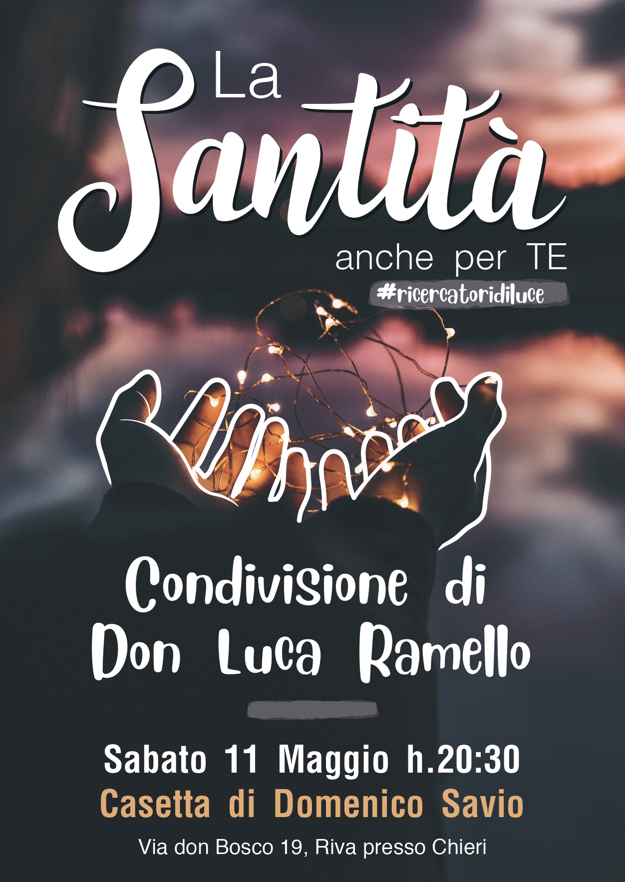 I festeggiamenti incominceranno la sera del sabato, presso la Casetta di Domenico Savio (Via don Bosco 19, Riva presso Chieri), con la condivisione a cura di Don Luca Ramello, Responsabile della Pastorale Giovanile Diocesana di Torino, dal titolo: “Ricercatori di Luce”, che andrà a toccare il tema della strenna di quest’anno: “La Santità anche per Te”.