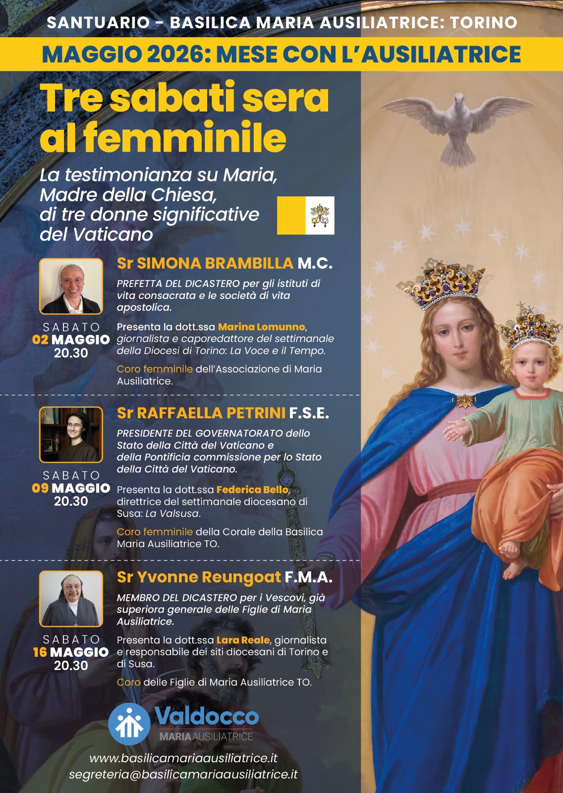 In occasione del mese con l’Ausiliatrice di maggio 2026 torna alla Basilica Maria Ausiliatrice di Torino l’appuntamento dei tre sabati sera al femminile: la testimonianza su Maria, Madre della Chiesa, di tre donne significative del Vaticano.