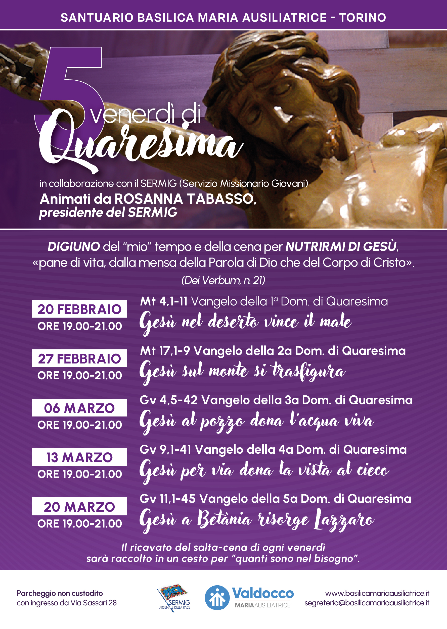 Ogni venerdì, dalle 19.00 alle 21.00, la comunità è invitata in Basilica Maria Ausiliatrice a vivere un semplice ma intenso percorso spirituale tipico del tempo di Quaresima. L’incontro prevede il salta‑cena (digiuno) e un ascolto prolungato della Parola: verrà meditato il Vangelo della domenica successiva, accompagnati dal commento di Rosanna Tabasso.
