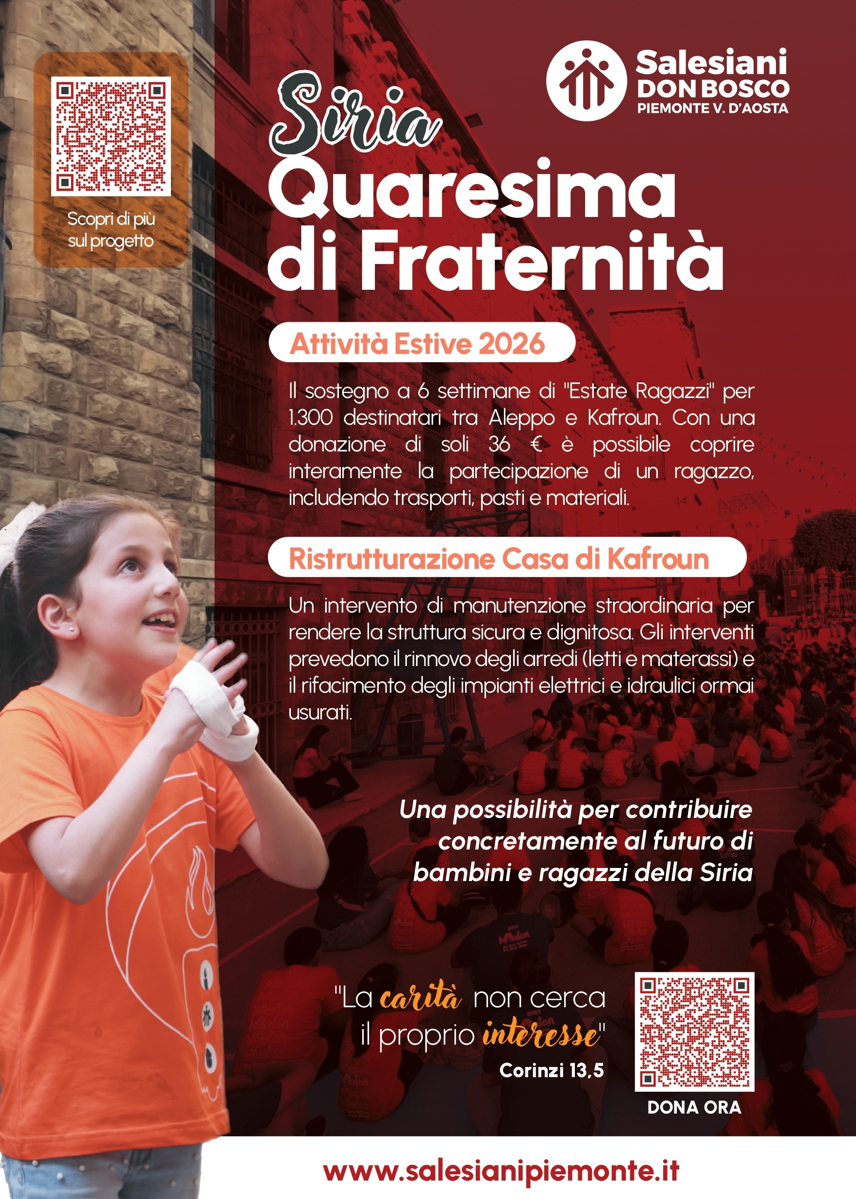 La Quaresima è sempre un tempo che ci richiama all’essenziale: alla cura, alla solidarietà, alla scelta concreta di stare accanto a chi vive ferite profonde. Per il 2026, la nostra Ispettoria rinnova questo impegno con uno sguardo particolare rivolto ai giovani di Aleppo e Kafroun, in Siria, terre segnate da oltre quattordici anni di crisi, instabilità e – più recentemente – dal devastante terremoto.